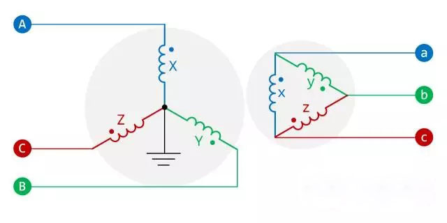 Y/d-11變壓器的繞組連接如下圖所示: