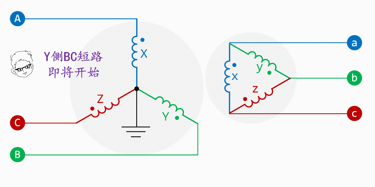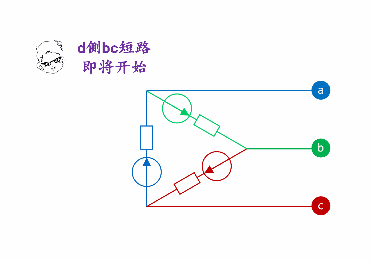 先分析三角連接的xyz電源發(fā)生bc短路:因a相沒有短路,故Ia為零,x繞組(藍(lán)色)和y繞組(綠色)電源串聯(lián),等效電勢為-(Ex + Ey) = Ez,等效阻抗為2倍系統(tǒng)阻抗,故z繞組(紅色)電源提供的短路電流是xy串聯(lián)繞組電流的2倍,如下面動態(tài)圖所示(時(shí)長15秒):