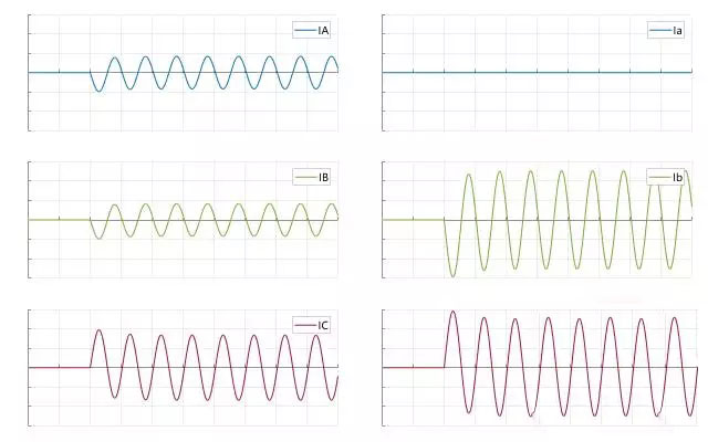 EMTP仿真d側(cè)bc短路,Y側(cè)和d側(cè)電流波形如下: