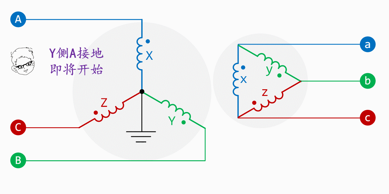 電源在d側(cè),Y側(cè)中性點(diǎn)接地,當(dāng)A相接地時(shí),X繞組—中性點(diǎn)—A相接地點(diǎn)形成回路,有短路電流,而Y、Z繞組無短路電流。繪制出d側(cè)繞組電流和abc相電流,如下面動態(tài)圖所示: