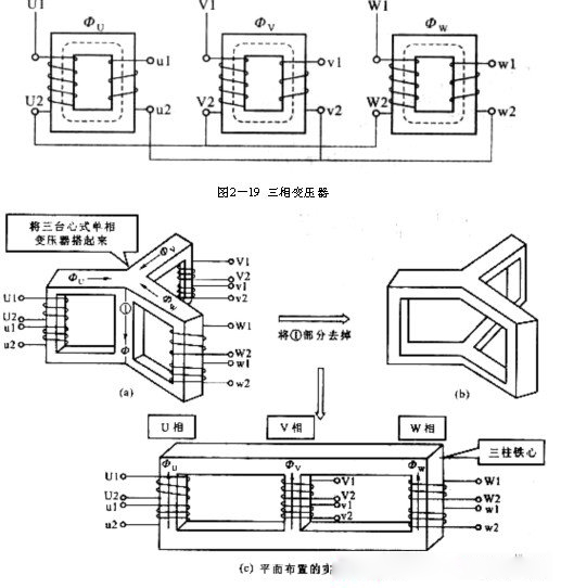 現代的電力系統都采用三相制供電,因而廣泛采用三相變壓器來實現電壓的轉換。三相變壓器可以由三臺同容量的單相變壓器組成,再按需要將一次繞組及二次繞組分別接成星形或三甬形聯結。圖2—19所示為一、二次繞組均用星形聯結的三相變壓器組。三相變壓器的另一種結構型式是把三個單相變壓器合成一個三鐵心柱的結構型式,稱為三相心式變壓器,如圖2—20(a)所示。由于三相繞組接入對稱的三相交流電源時,三相繞組中產生的主磁通也是對稱的,故三相磁通之和等于零,即中間鐵心柱的磁通為零,因此中間鐵心柱可以省略,成為(b)圖形式,實際中為了簡化變壓器鐵心的剪裁及疊裝工藝,均采用將U、V、W三個鐵心柱置于同一個平面上的結構型式,如圖2—20(c)所示。