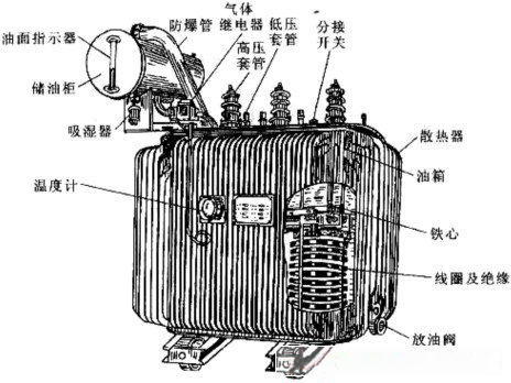 在三相電力變壓器中,目前使用最廣的是油浸式電力變壓器,它主要由鐵心、繞組、油箱和冷卻裝置、保護裝置等部件組成,其外形如圖2—21所示,現簡介如下: