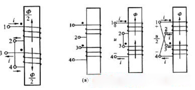 當電流從兩個同極性端流入(或流出)時,鐵心中所產生的磁通方向是一致的。如圖2—23所示,1端和3端為同名端,電流從這兩個端點流人時,它們在鐵心中產生的磁通方向相同。同樣可判斷圖2—25中的兩個繞組,則1端和4端為同名端。搞清了同名端的概念以后,就不難理解為什么在圖2—10及圖2—15中一次繞組的繞向及電壓電流方向均一樣,而二次繞組中的電壓和電流方向在兩個圖中卻正好相反。