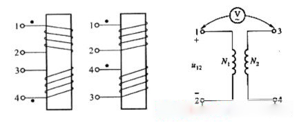 因為變壓器的一、二次繞組繞在同一個鐵心上,都被磁通Ф交鏈,故當磁通交變時,在兩個繞組中感應出的電動勢有一定的方向關系,即當一次繞組的某一端點瞬時電位為正時,二次繞組也必有一電位為正的對應端點。這兩個對應的端點,我們稱為同極性端或同名端,通常用符號“· ”表示。