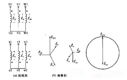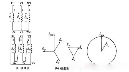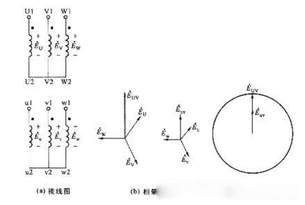 如圖2—31所示,變壓器一次繞組用星形聯結,二次繞組用三角形聯結,且二次繞組u相的首端u1與v相的末端v2相連,即如圖2—31(a)所示的逆序連接,如一、二次繞組的首端為同名端,則對應的相量圖如圖2—31(b)所示。如圖2—31(c)所示。