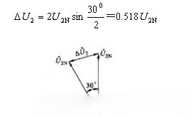 如果兩臺變壓器的變比和短路阻抗均相等,但是聯結組別不同時并聯運行,則其后果十分嚴重。因為聯結組別不同時,兩臺變壓器二次繞組電壓的相位差就不同,它們線電壓的相位差至少為30o,因此會產生很大的電壓差ΔU2。圖2-34為Y,y0和Y,dll兩臺變壓器并聯,二次繞組線電壓之間的電壓差ΔU2。其數值為